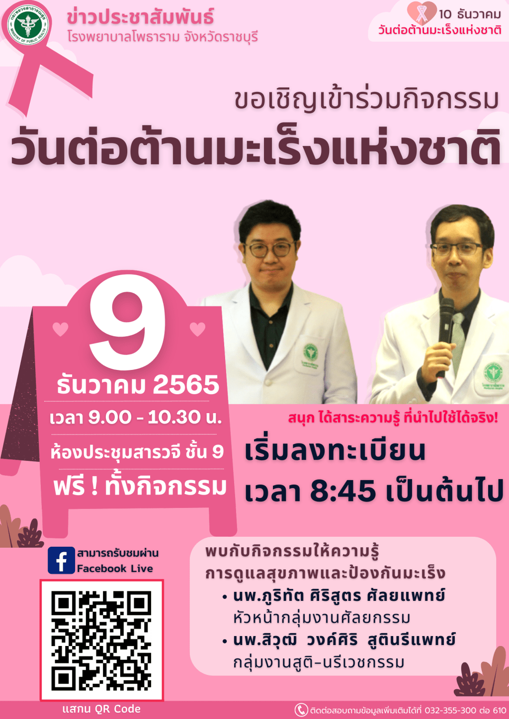 วันที่ 10 ธันวาคม 2565 เป็นวันต่อต้านมะเร็งแห่งชาติ ทางโรงพยาบาลมีกิจกรรมดีมาให้ผู้รับบริการหรือประชาชนที่สนใจเข้าร่วมนะครับ เสวนาโดย นพ.ภูริทัต ศิริสูตร ในหัวข้อมะเร็งเต้านมและมะเร็งลำไส้ใหญ่ กดลิ้งค์ด้านบนได้เลยครับ